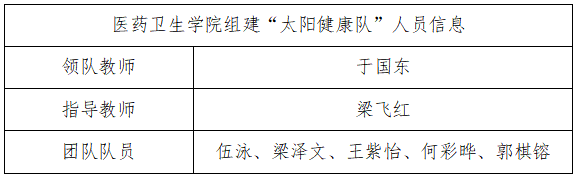 医药卫生学院组建“太阳健康队”代表我校出赛(队伍信息见下表),经过一个月的认真准备、刻苦训练,以总分第二的优异成绩通过初赛,闯入总决赛。
