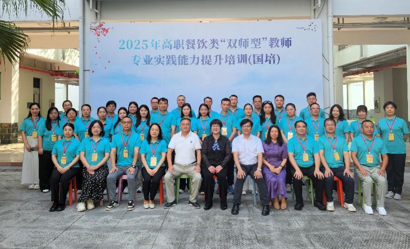 7月6日上午,2025年高职餐饮类“双师型”教师专业实践能力提升国家级培训班(国培)开班典礼在我校举行。来自广东省21所高职院校的40位骨干教师齐聚“世界美食之都”,开启为期两周的集中研修。广东省职业院校教师素质提高项目管理办公室主任邓兰兰,我校组织人事处、烹饪学院负责人及全体学员出席典礼。