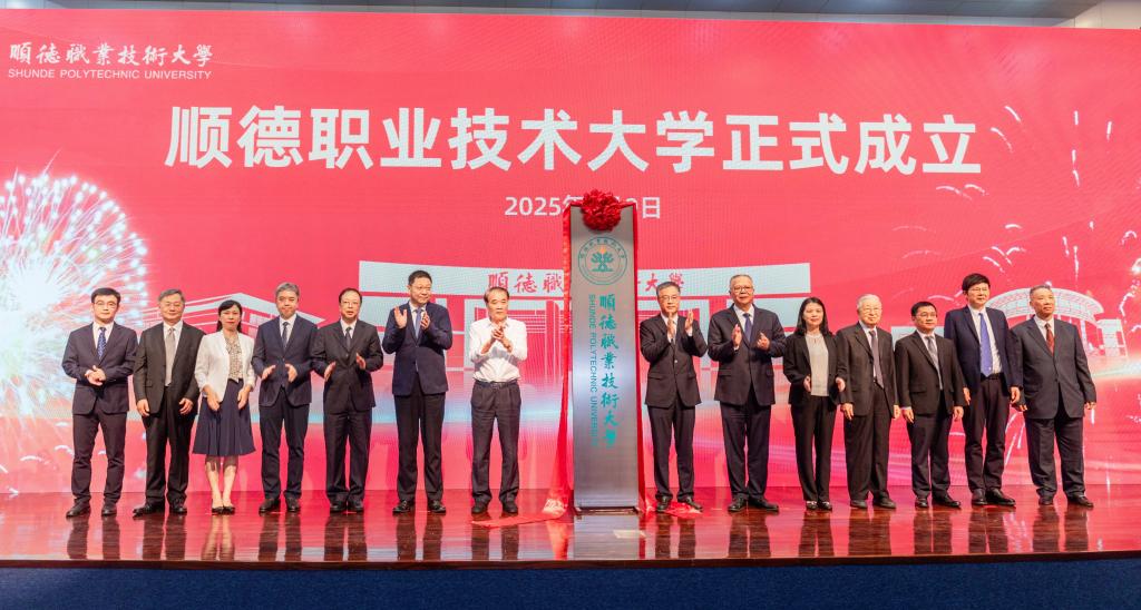 7月9日,顺德职业技术大学成立大会举行。省人大常委会原主任欧广源,市委书记唐屹峰、市长白涛、市人大常委会主任胡钛、市政协主席李政华等领导出席活动,共同为顺德职业技术大学揭牌。