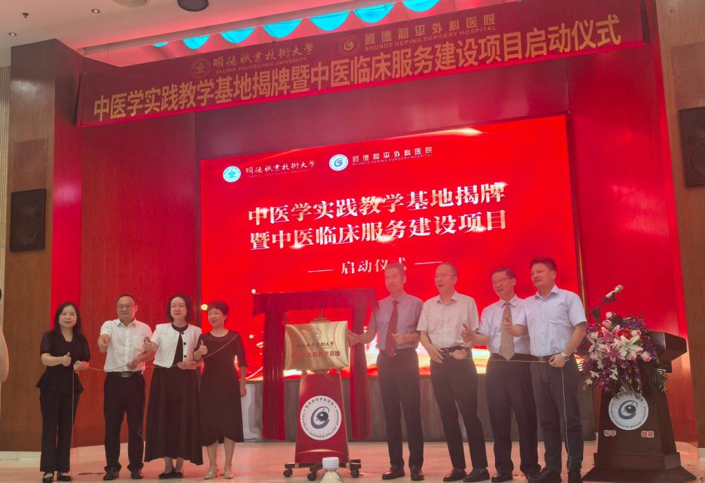 在热烈的掌声中,双方领导为“顺德职业技术大学中医学实践教学基地”揭牌,标志着合作项目正式落地。