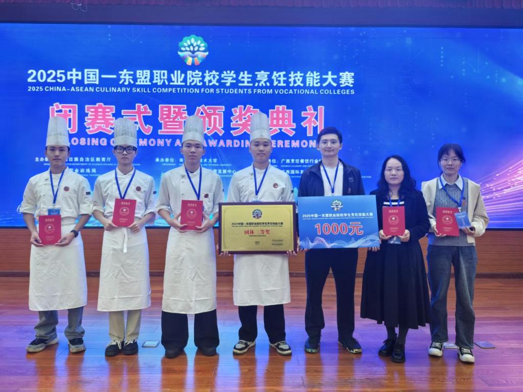 10月22日至24日,由广西壮族自治区教育厅与香港职业训练局共同主办,南宁职业技术大学与桂港现代职业教育发展中心承办的2025中国——东盟职业院校学生烹饪技能大赛在南宁举办.来自中国10个省区和香港特别行政区,以及泰国、越南、印尼、老挝等东盟国家的共40支代表队、151名参赛选手参加比赛。我校由烹饪学院4名学生(曹桃生、李航宇、罗梓梁、李志健)组成的代表队获得食品雕刻赛项一等奖、中式烹调赛项二等奖、西式烹调赛项二等奖、中式面点赛项三等奖、团体三等奖,烹饪学院教师王红梅、李惠获优秀指导教师称号。