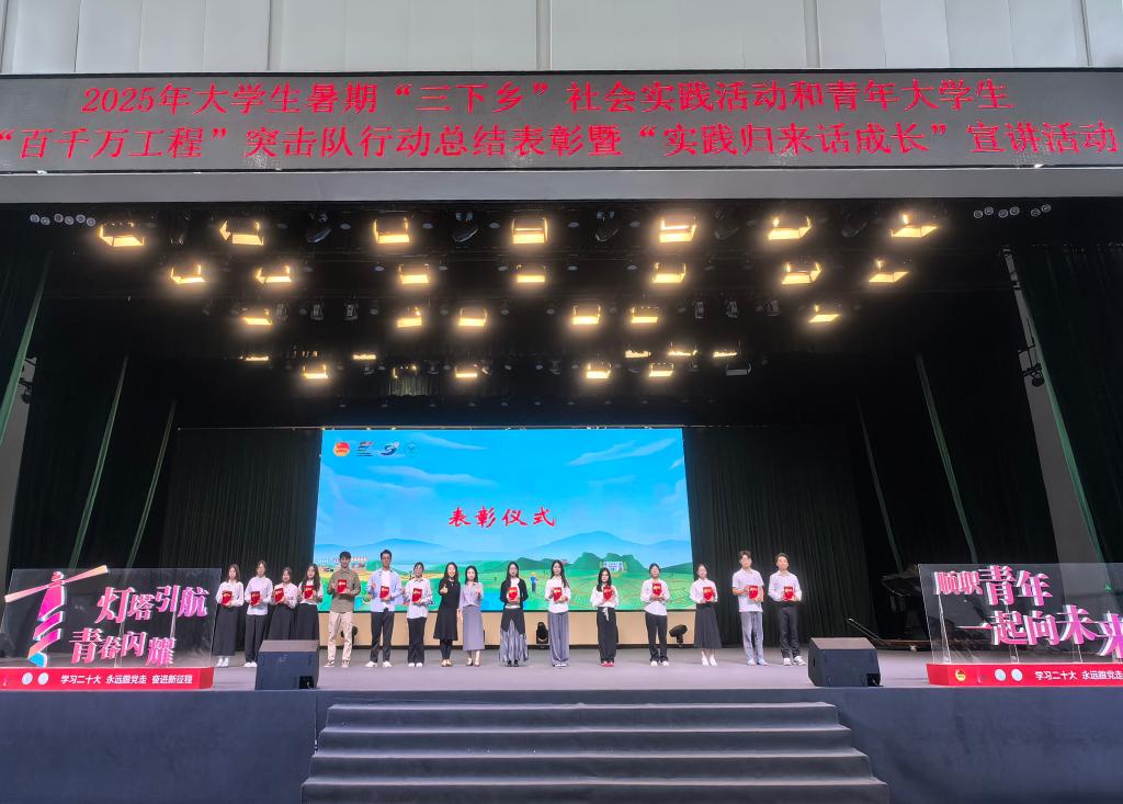 活动现场对本年度社会实践活动中涌现出的先进集体和个人进行表彰。其中,5个二级学院获“优秀组织奖”;20个队伍获“优秀团队奖”,32名指导的教师获“优秀指导老师”称号;155名同学获“优秀个人”荣誉称号。在热烈的掌声中,各获奖组织、队伍代表及师生代表依次上台领奖,接受这份属于奋斗者的荣光。这份沉甸甸的荣誉,不仅是对他们辛勤付出与实践成果的肯定,更是对全校师生积极投身社会实践的激励与号召。