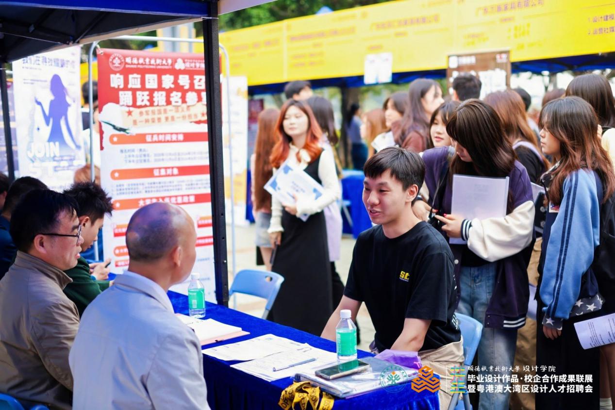 招聘会现场人气旺盛,118家来自粤港澳大湾区的设计企业、文化创意公司、科技企业等现场设招聘摊位,毕业生们纷纷向心仪岗位投递简历。企业代表通过观摩毕业设计作品,直观评估学生创意能力与实践水平,实现精准人才对接。