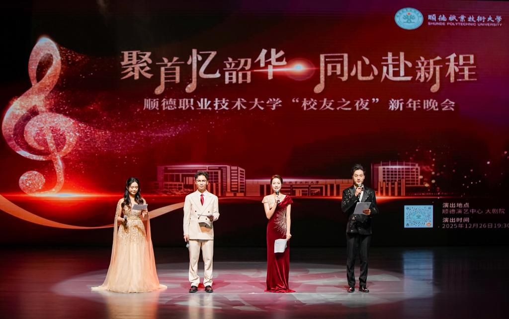 硕果盈枝辞旧岁,欢歌笑语迎新年。12月26日晚,顺德职业技术大学“校友之夜”新年晚会在顺德演艺中心大剧院举行,学校首届校友文化节系列活动圆满收官。整场晚会以“聚首忆韶华 同心赴新程”为主题,以青春旋律与时代精神交织为主线,分为“青春之火”“薪火相传”“筑梦未来”3个篇章,通过17个精彩的歌舞、器乐节目,展现顺职人薪火相传、砥砺奋进的蓬勃朝气,谱写校友与母校同频共振、携手同行的华彩乐章。