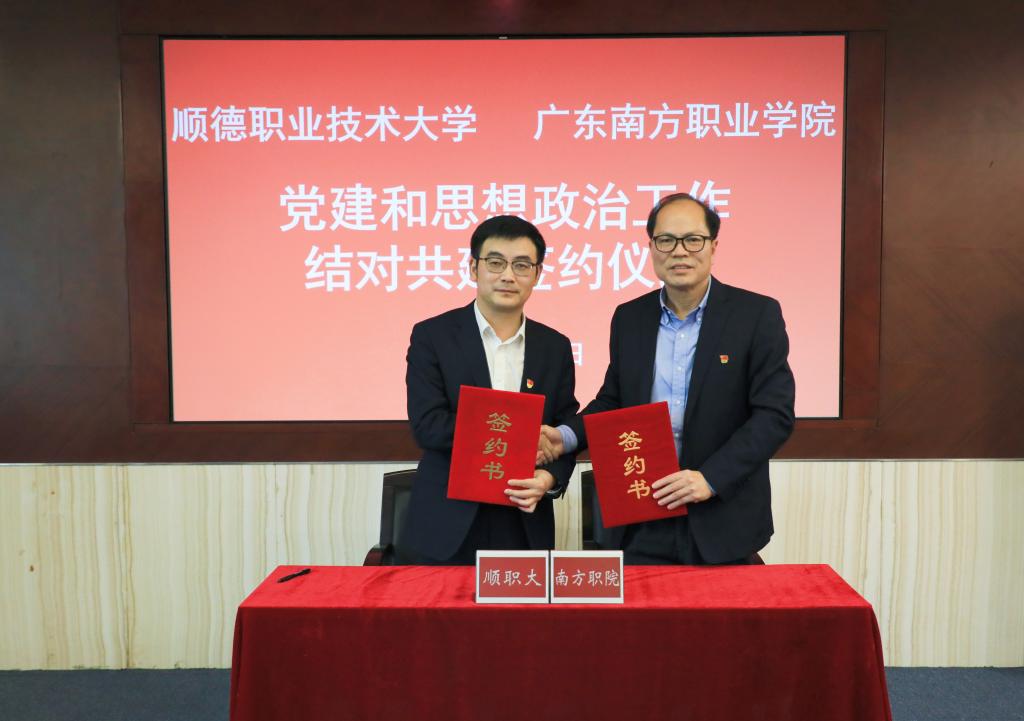 12月31日,顺德职业技术大学-广东南方职业学院党建和思想政治工作结对共建协议签约仪式在行政楼1117会议室举行,深入学习贯彻习近平总书记关于加强党的建设的重要思想,落实党中央决策部署和省委教育工委工作安排,推动民办高校党建和思政工作提质增效。