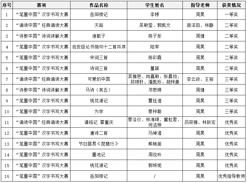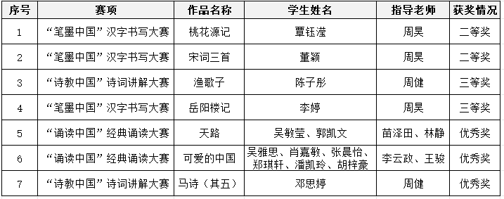 近日,第七届中华经典诵写讲大赛获奖名单公布,我校学生作品获国家级二等奖2项、三等奖2项、优秀奖3项;省级一等奖1项、二等奖5项、三等奖4项、优秀奖5项、优秀指导教师1人。