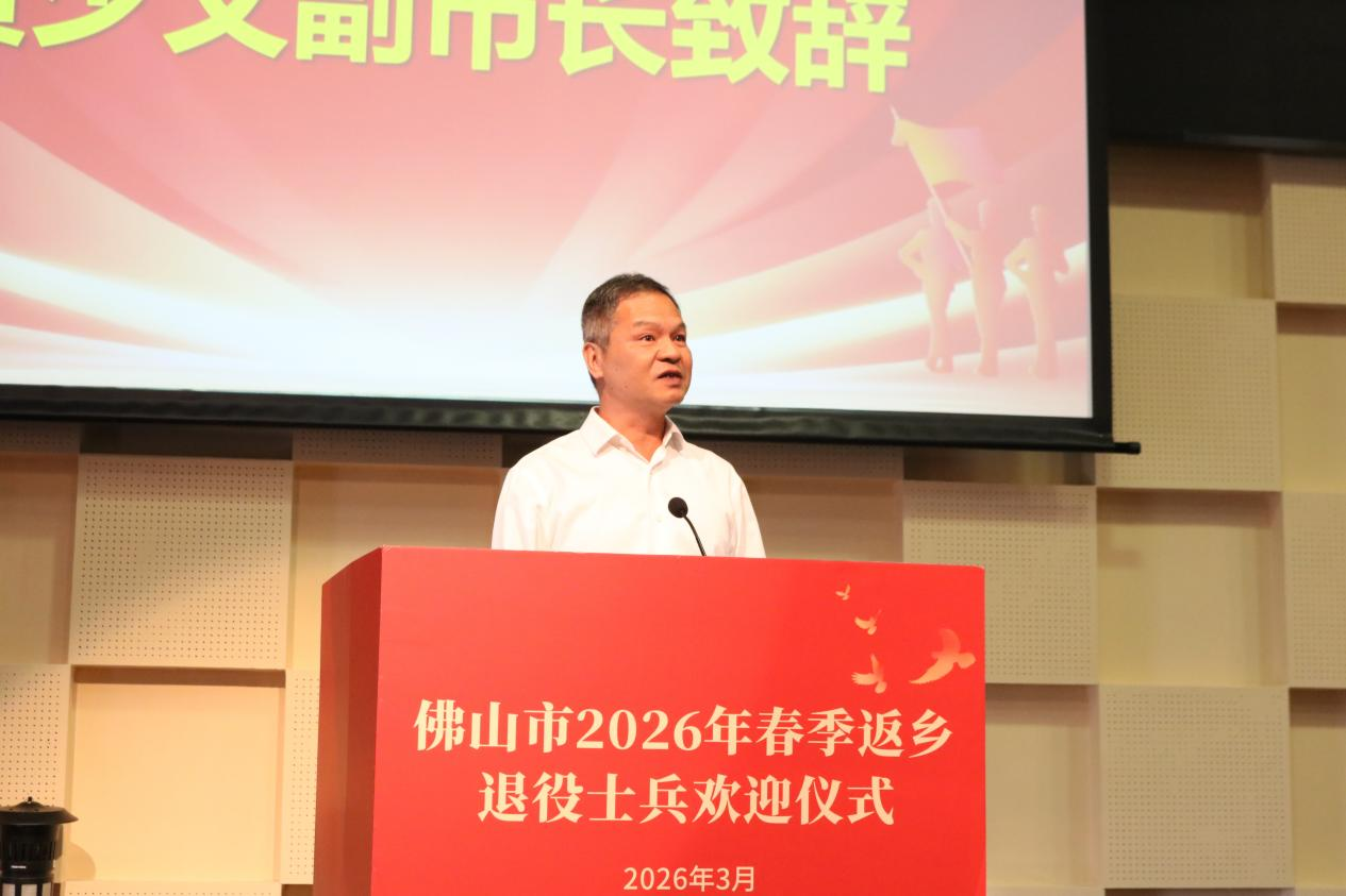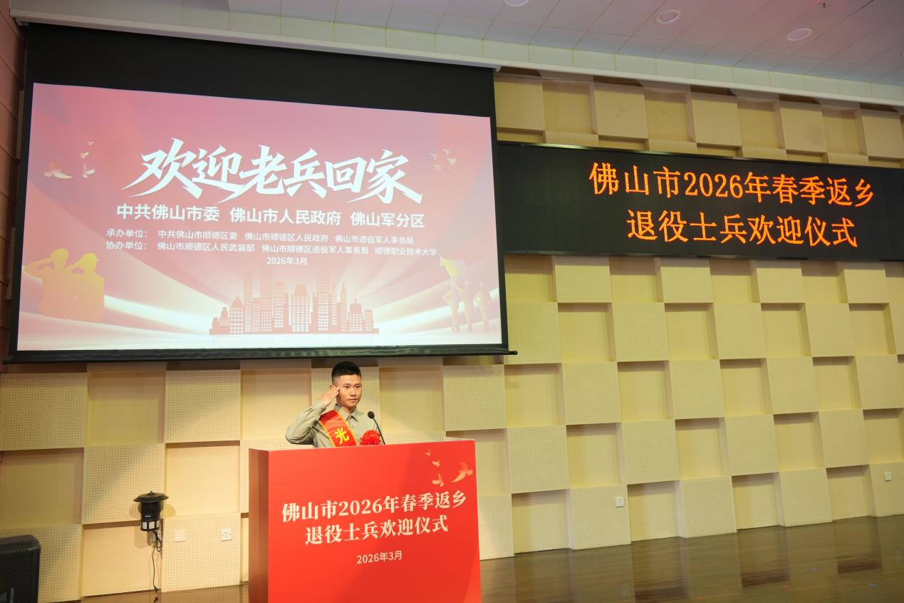 3月19日,佛山市2026年春季返乡退役士兵欢迎仪式在我校举行。佛山市人民政府副市长黄少文,学校党委书记卢清华,佛山市政府副秘书长贺智涛,佛山市退役军人事务局党组书记、局长谢国高,佛山军分区有关领导,顺德区委常委、政法委书记陈泳槟,顺德区人民武装部有关领导,顺德区退役军人事务局党组书记、局长罗冠明,顺德区各镇(街道)退役军人服务站分管领导、顺德区爱国拥军促进会代表、学校院办相关领导、广东顺德创业培训学院相关领导及顺德区2026年春季返乡退役士兵等参加活动。
