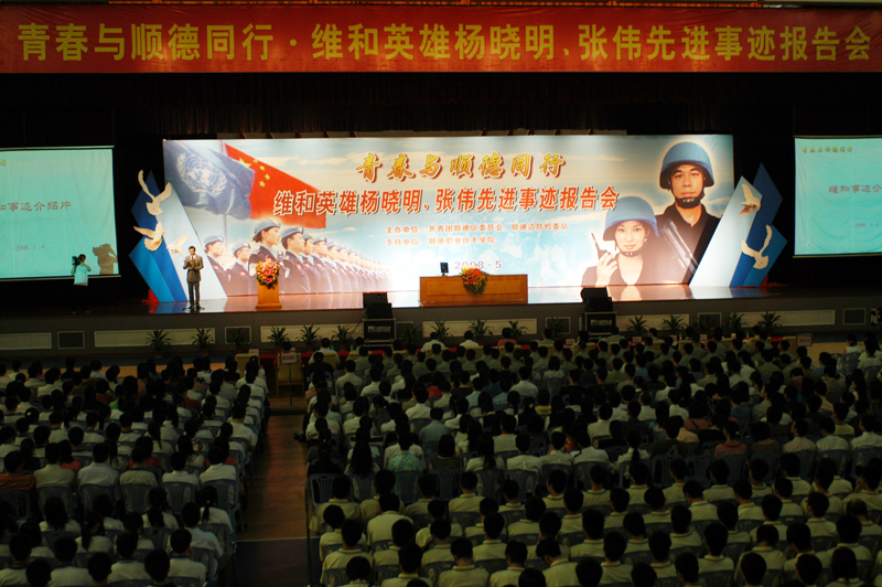 5月4日下午,顺德区团委在我院举行海地维和英雄事迹报告会。来自顺德边防检查站的两位维和警官杨晓明、张伟分别向来自我院、顺德一中等学校的千名学子介绍自己在海地的战斗经历,并告诉广大学子,最大的爱国就是努力学习文化知识。
