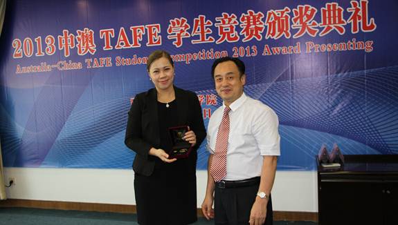 9月11日下午,新南威尔士州政府南中国区及香港地区高级代表Cher Jones女士莅临我校,为我校在2013年中澳TAFE学生竞赛中获奖的学生、指导教师颁发奖牌和证书。我校党委副书记齐振彪及TAFE项目任课教师、获奖学生等出席了颁奖典礼。
