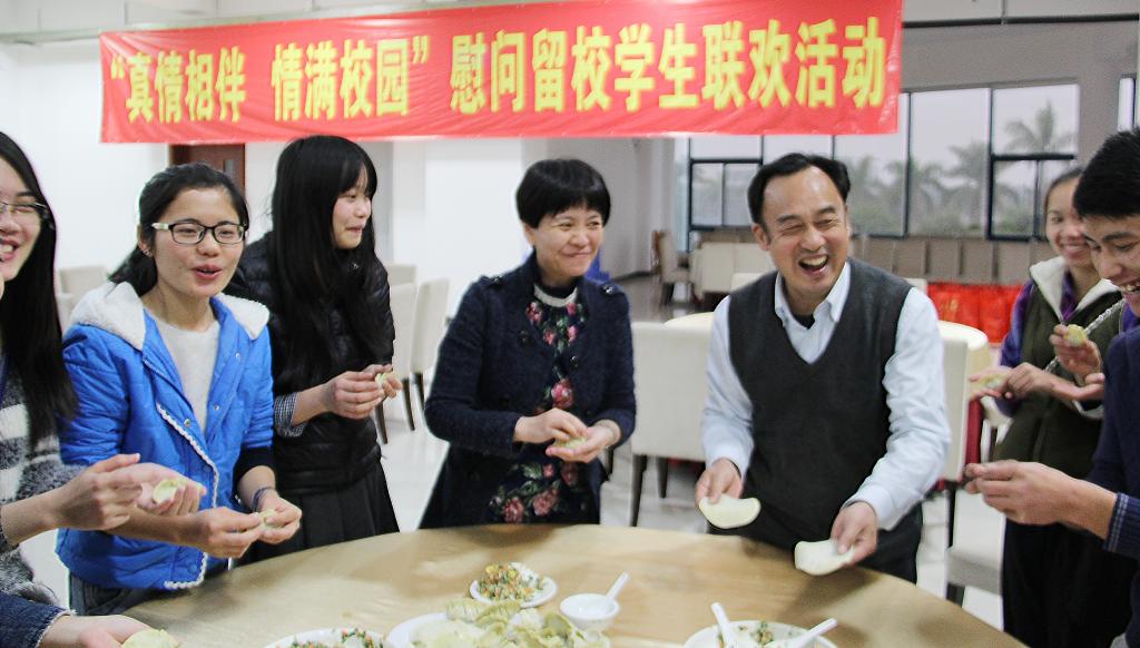 为了让留校学生度过一个欢乐、祥和、喜庆的新春佳节,在春节来临之际,学生工作部于2月10日组织开展了“真情相伴 情满校园”留校学生慰问联欢(团年饭)活动。我校党委副书记齐振彪,共青团顺德区委书记陈影然、副书记钟德慰,学生工作部负责人,团区委相关工作人员,我校相关老师等参加了活动,与同学们共度新春佳节,为他们送去温暖。