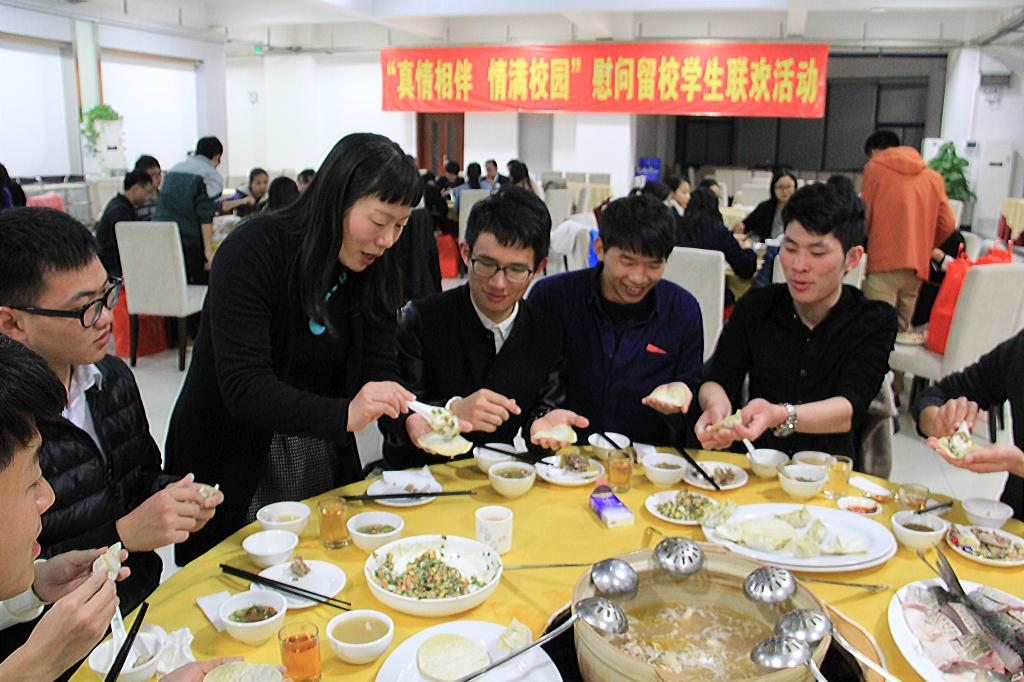 为了让同学们感受到新年欢乐祥和的气氛,学校领导与团区委领导按照传统习俗为在座的同学们派发了新年“利是”与过年礼包,给同学们送去了最真挚的祝福。随后,学校领导、团区委领导、我校老师和学生们同包幸福饺子,喜迎新春,共迎羊年。