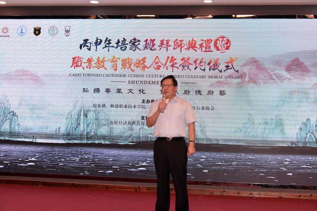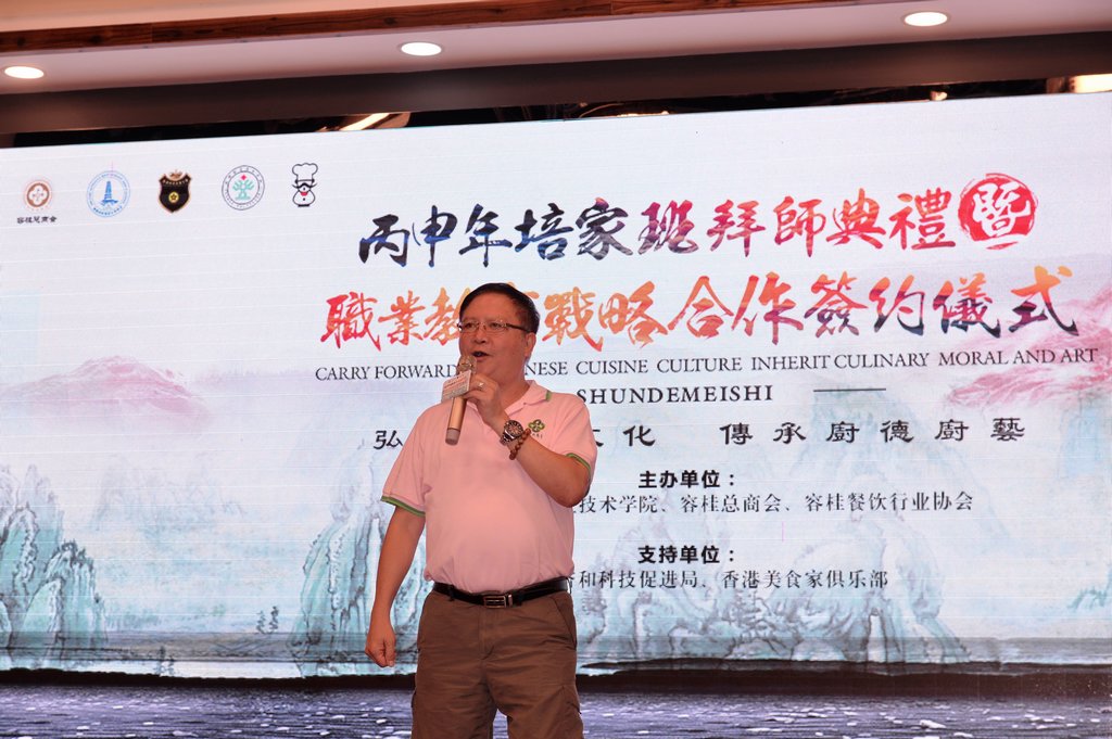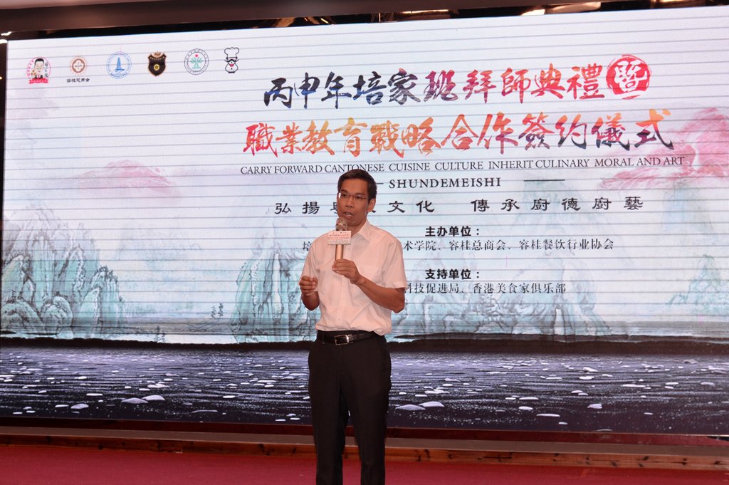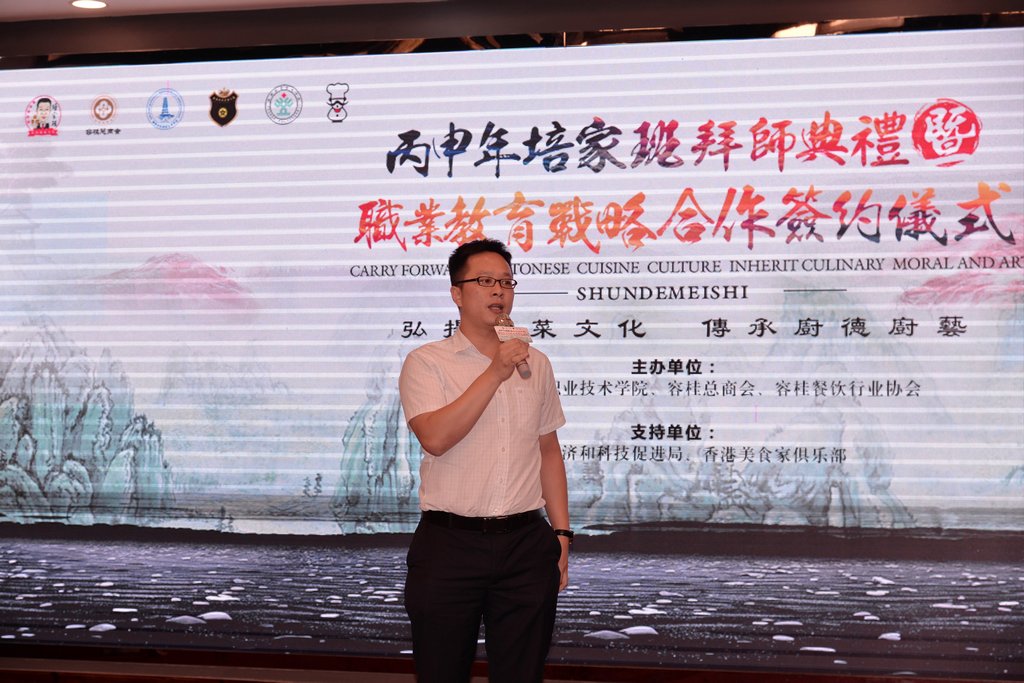 顺德区政协副主席、我校校长夏伟讲话。他说,顺德是世界“美食之都”,也是粤菜发源地,学校一直以来坚持服务地方,为顺德餐饮业培养输送了大批人才。此次合作在政府、行业、协会和企业的积极支持和大力推动下,开创了职业教育的新模式,是中国特色“双元制”、“现代学徒制”的积极探索。学生通过拜师成为学徒,树立高度的事业追求,在名师的严格指导下学习技艺,旨在培养成为未来餐饮行业的精英型人才。