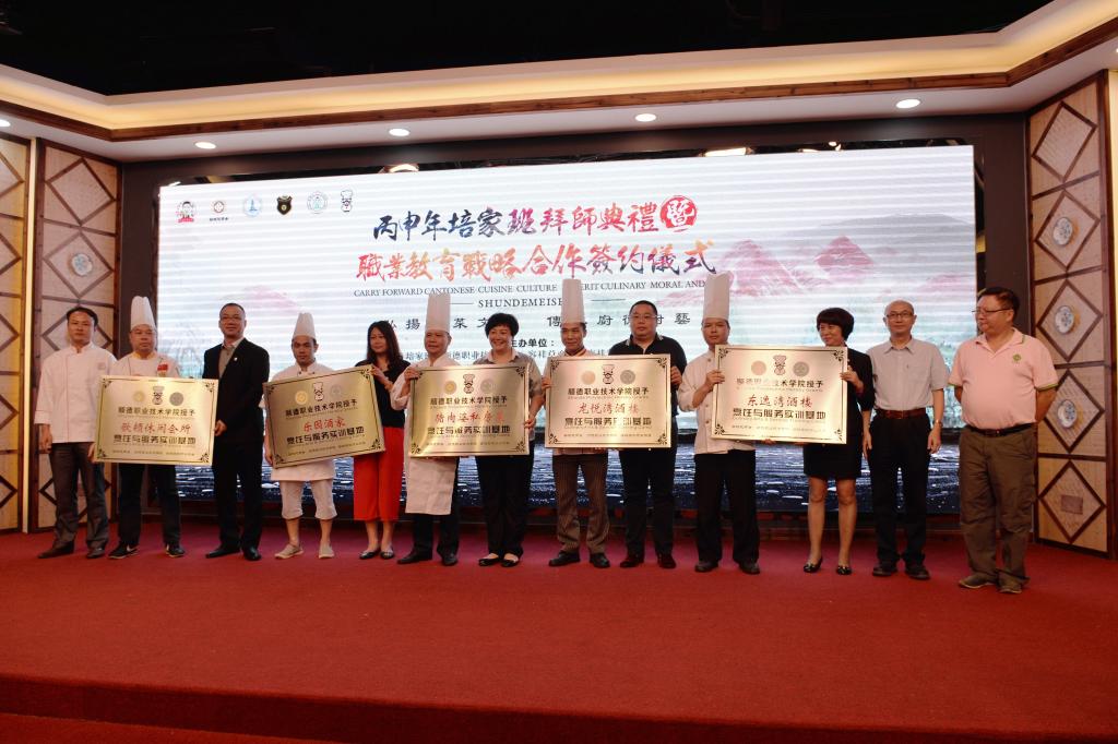 会上举行了签约、授牌仪式,包括大快活酒楼、猪肉婆私房菜、龙悦湾酒楼、东灶餐饮集团等16家顺德餐饮名店,成为了我校“厨艺与服务实训合作基地”。中国烹饪大师、国家级评委、“培家班”创始人梁浩培先生被聘为我校客座教授。