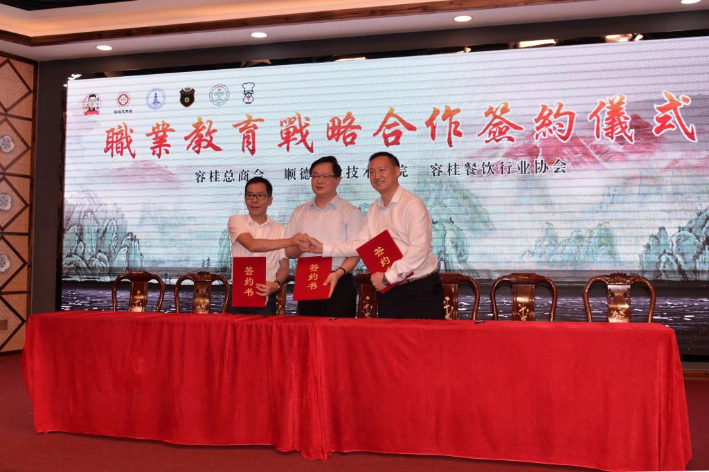 7月25日,我校与容桂总商会、容桂餐饮行业协会在容桂大快活酒楼举行职业教育战略合作签约仪式,并与顺德知名餐饮企业合作共建“厨艺与服务实训合作基地”。出席本次活动的领导嘉宾有:中共顺德区委常委、统战部部长周驭洪,佛山市教育局副局长徐旭雁,顺德区政协副主席、我校校长夏伟,容桂街道党工委副书记、街道办事处主任龙仲英,顺德区教育局副局长罗劲柏,顺德区旅游局副局长欧伟中,容桂总商会会长孙志恒、副会长(秘书长)黄淼,容桂餐饮行业协会会长罗兆波、副会长叶志光,中央电视台《寻味顺德》导演刘硕、费牗明,中国烹饪大师、国家级评委、“培家班”创始人梁浩培,香港“食神”、香港美食家俱乐部荣誉主席梁文韬,香港美食家俱乐部主席区应昌。我校副校长徐刚、纪委书记谭谦章,党办校办、党委宣传部、教务处等部门相关负责人,酒店与旅游管理学院师生代表参加了活动。