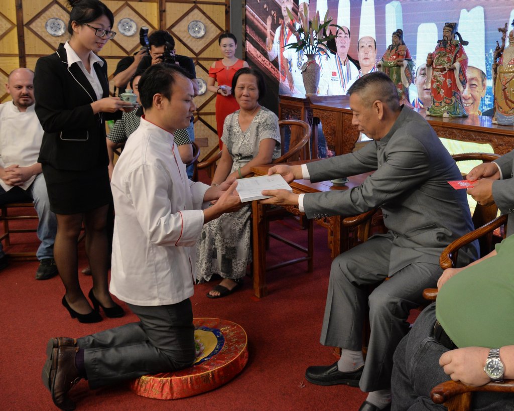 我校学生代表向参与合作的餐饮名店名师进行拜师仪式