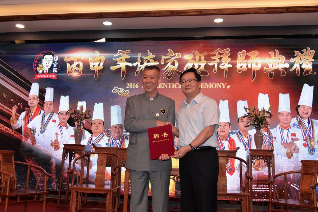 我校夏伟校长(右一)向中国烹饪大师梁浩培先生(左一)颁发聘书