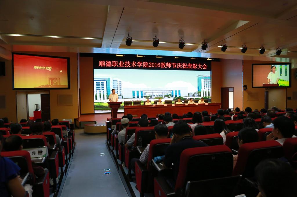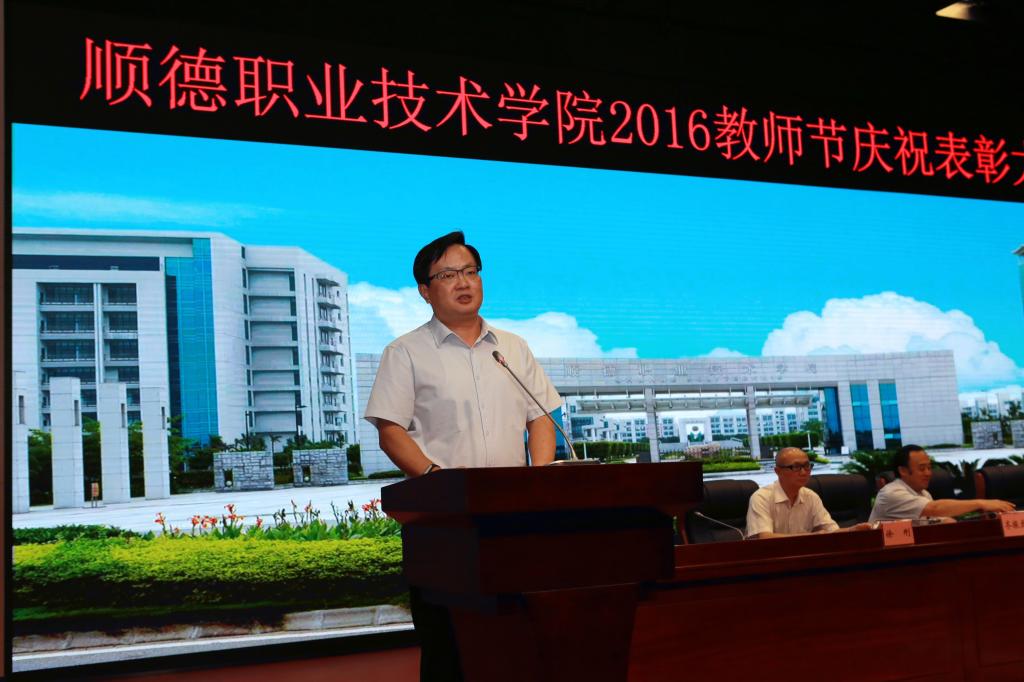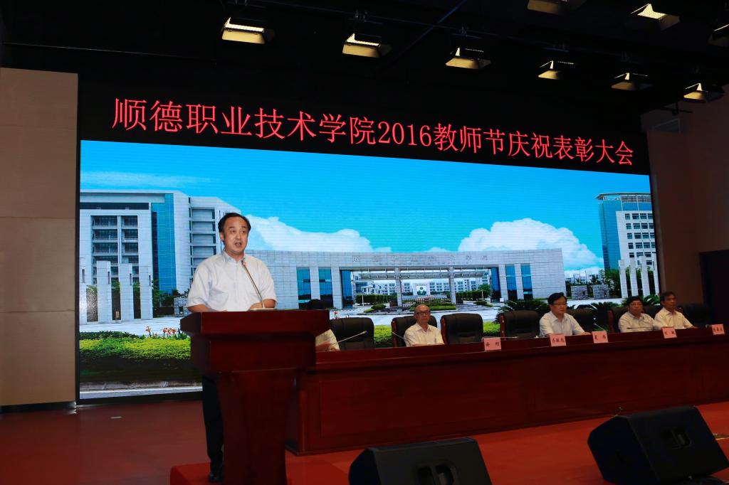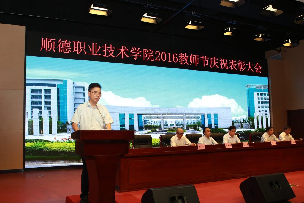 9月7日下午,我校在李佘少鸿楼一楼报告厅和5号报告厅举办2016年教师节庆祝表彰大会。学校领导夏伟、刘毓、齐振彪、陈粟宋、徐刚、谭谦章,顺德民营企业发展商会常务副会长郑纯杰,学校全体教职员工参加了大会。会议由我校党委副书记、副校长刘毓主持。