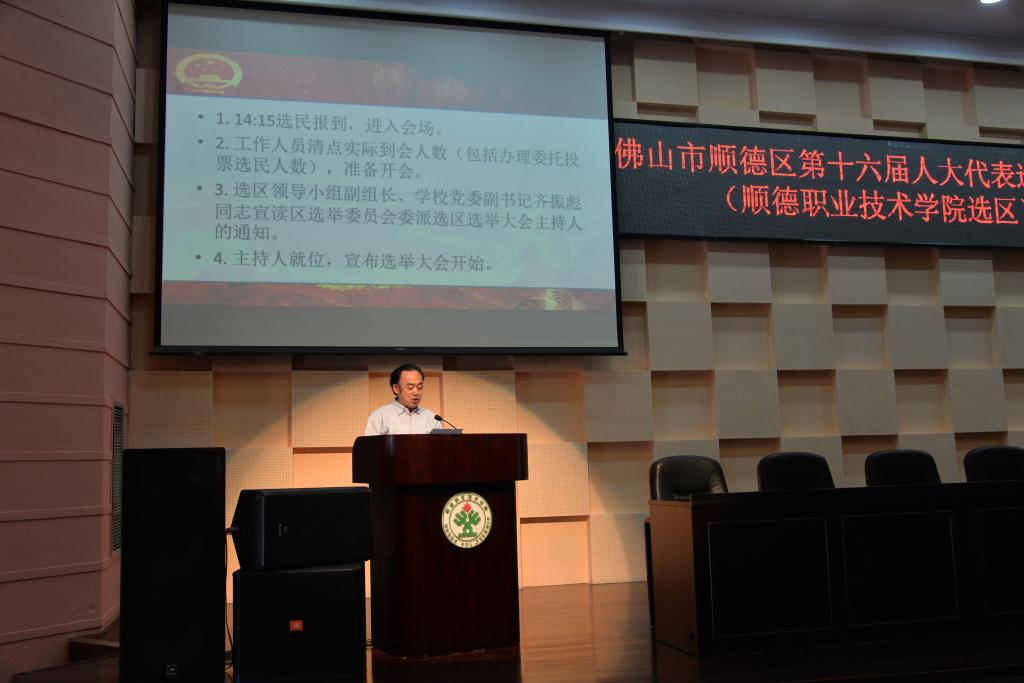 选举大会正式开始前,选区选举工作领导小组副组长、学校党委副书记齐振彪宣读《顺德区选举委员会委派选区选举大会主持人通知》,《通知》委派学校党委副书记、副校长刘毓为选举大会主持人。