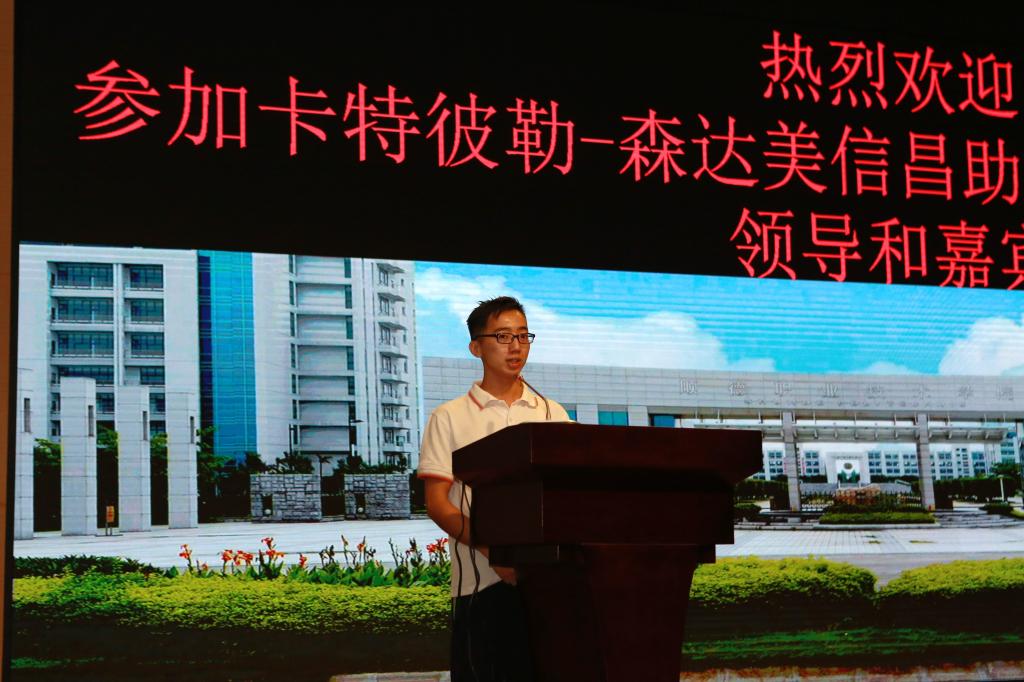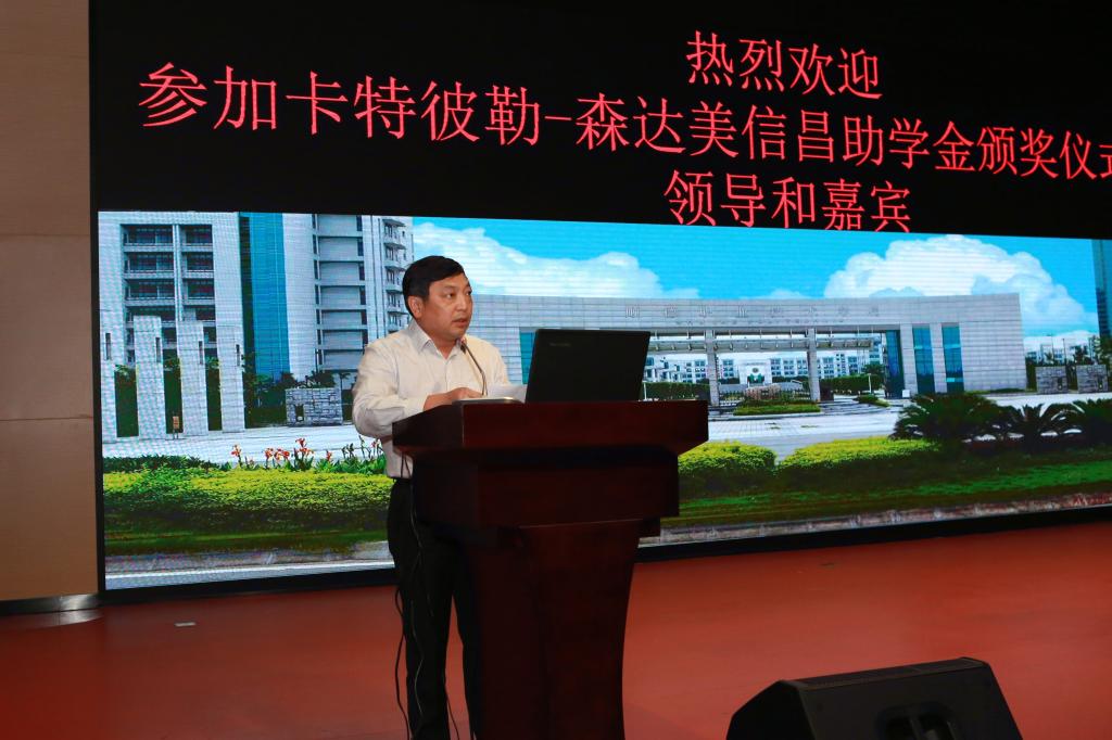卡特彼勒-森达美信昌公司董事总经理邵志仁先生作勉励发言。他说,公司用实际行动践行卡特彼勒“可持续发展文化”的承诺,从“教育、环境、人道主义援助”等方面积极履行企业的社会责任,以对社会负责的方式参与和促进当地经济、教育、社区发展。他十分赞赏余世野同学的代表发言,同时,他期望9位获得助学金的同学努力学习,钻研专业,不断提高自己,将来做一个对社会有贡献的人。