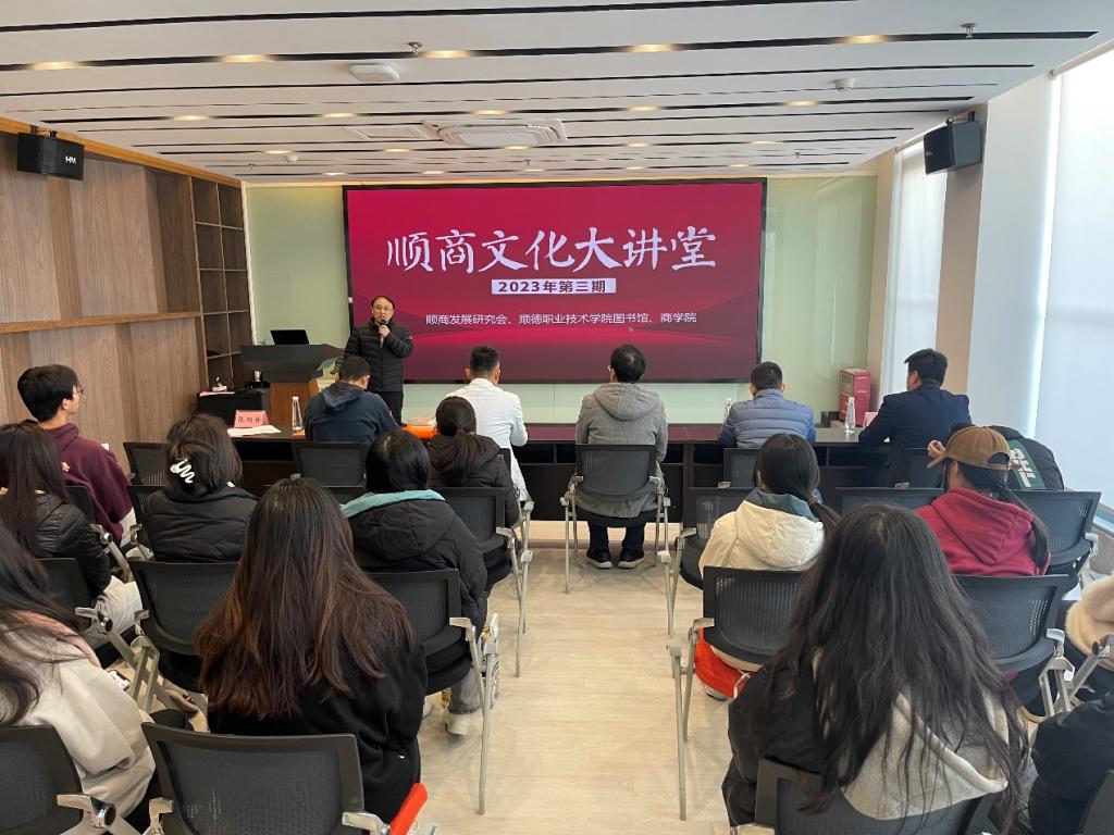 12月20日下午,第三期顺商文化大讲堂在图书馆六楼读者活动室举行。活动由顺商发展研究会,学校图书馆、商学院承办,邀请广东省作家协会会员、顺德区作家协会主席团成员、散文写作部主任胡辙作“顺德人文景观中的精神内涵”专题讲座。顺德区作家协会主席王茂浪,图书馆副馆长李旋波,商学院院长张明林、商学院副院长兼顺商发展研究会秘书长张成、副秘书长刘尚成及60多个学生代表等参加活动。活动由商学院院长张明林主持。