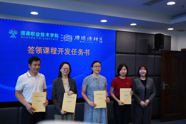 会上,我校与顺德渔村集团签署战略合作意向书,双方携手合作,共同打造人才培养“明德班”。领导嘉宾还为顺德渔村集团授予“产教融合创新实践基地”牌匾、为企业导师颁发产业导师证书。课程模块负责人签领课程开发任务书。