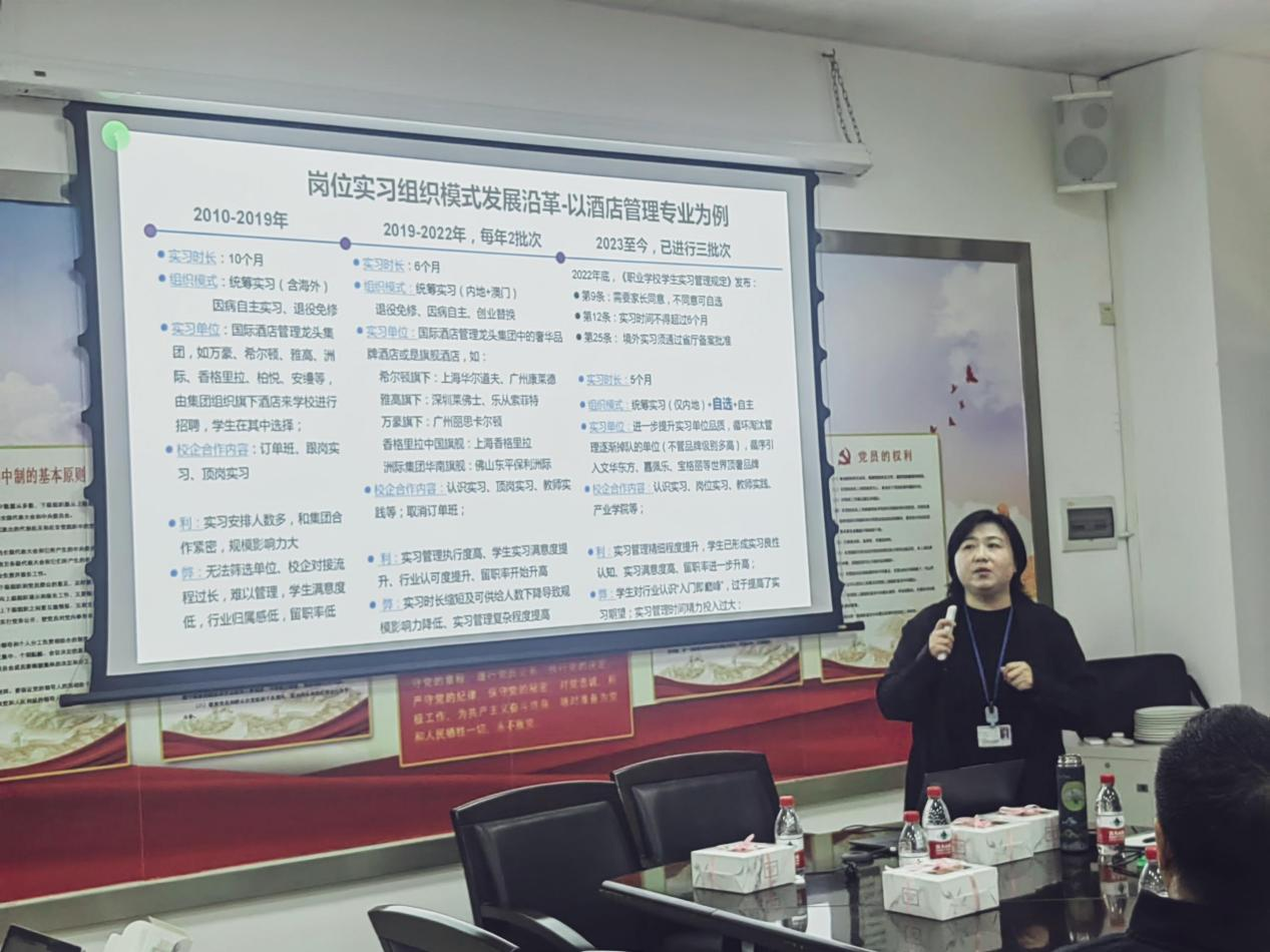 酒店与旅游管理学院副院长储晶重点介绍了酒店与旅游管理学院的实习工作的组织开展方式、实习管理的核心理念、学生实习过程的安全保障机制,并分享了酒管学院实习过程管理的实施经验。