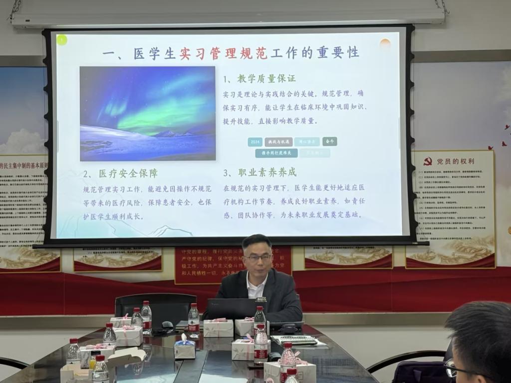 医药卫生学院副院长杨文豪就学院毕业论文和实习作了工作汇报。他介绍了医药卫生学院毕业生实习管理规范和毕业论文(设计)的管理规范,并对实践教学工作经验总结进行总结,也对未来工作进行了展望。
