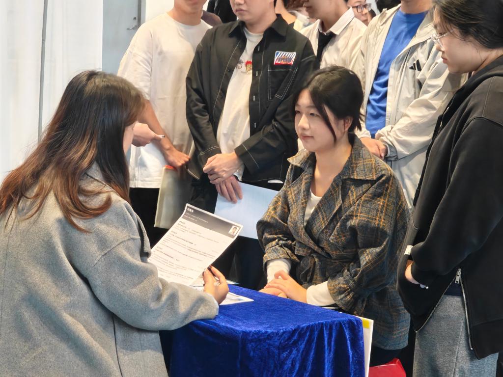 梁銶琚堂内人头攒动。毕业生手持简历,积极与招聘代表交流,了解岗位要求、发展空间和薪酬待遇。会场各企业展位前排起长队,招聘代表耐心解答疑问,介绍企业情况和岗位需求。